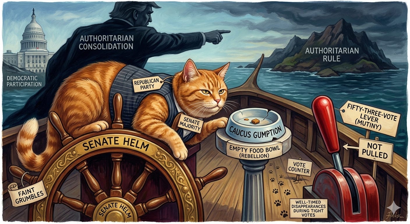 The Republican Party, firmly at the Senate’s helm, has shown all the rebellion of a cat mildly annoyed by an empty food bowl, some faint grumbles, and a few well-timed disappearances during tight votes. Yet there’s no grand mutiny, no dramatic pulling of the fifty-three-vote lever, no caucus with the gumption to declare: “Alright, that’s quite enough.” Political scientists, referencing the literature on democratic backsliding, describe the party as an enabling party, one that offers legislative support for authoritarian consolidation while keeping the outward framework of democratic participation intact.