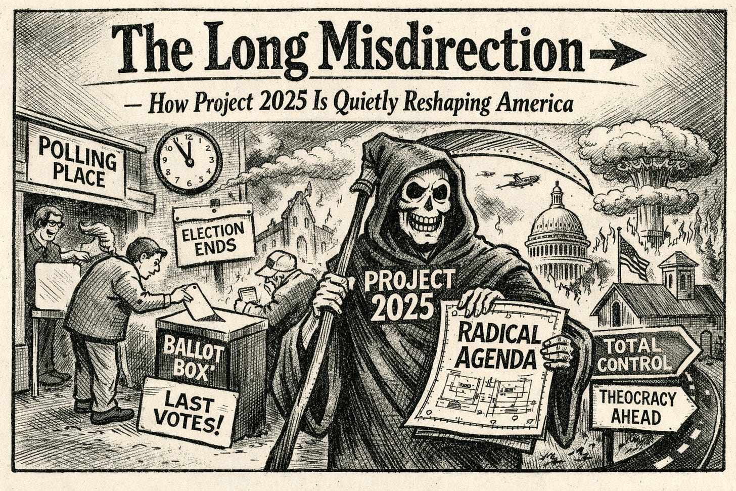 Project 2025 operates behind the scenes, with the Long Misdirection as its theater. Sensational headlines, political drama, and grandiose briefings are all just distractions while the real machinery ( deciding who votes and how those votes are counted) quietly runs. The apocalypse doesn’t always arrive with angels and trumpets; sometimes it’s a rigged election, complete with smoke machines and an overly long tie. The show isn’t over yet; the final act is only just getting started.