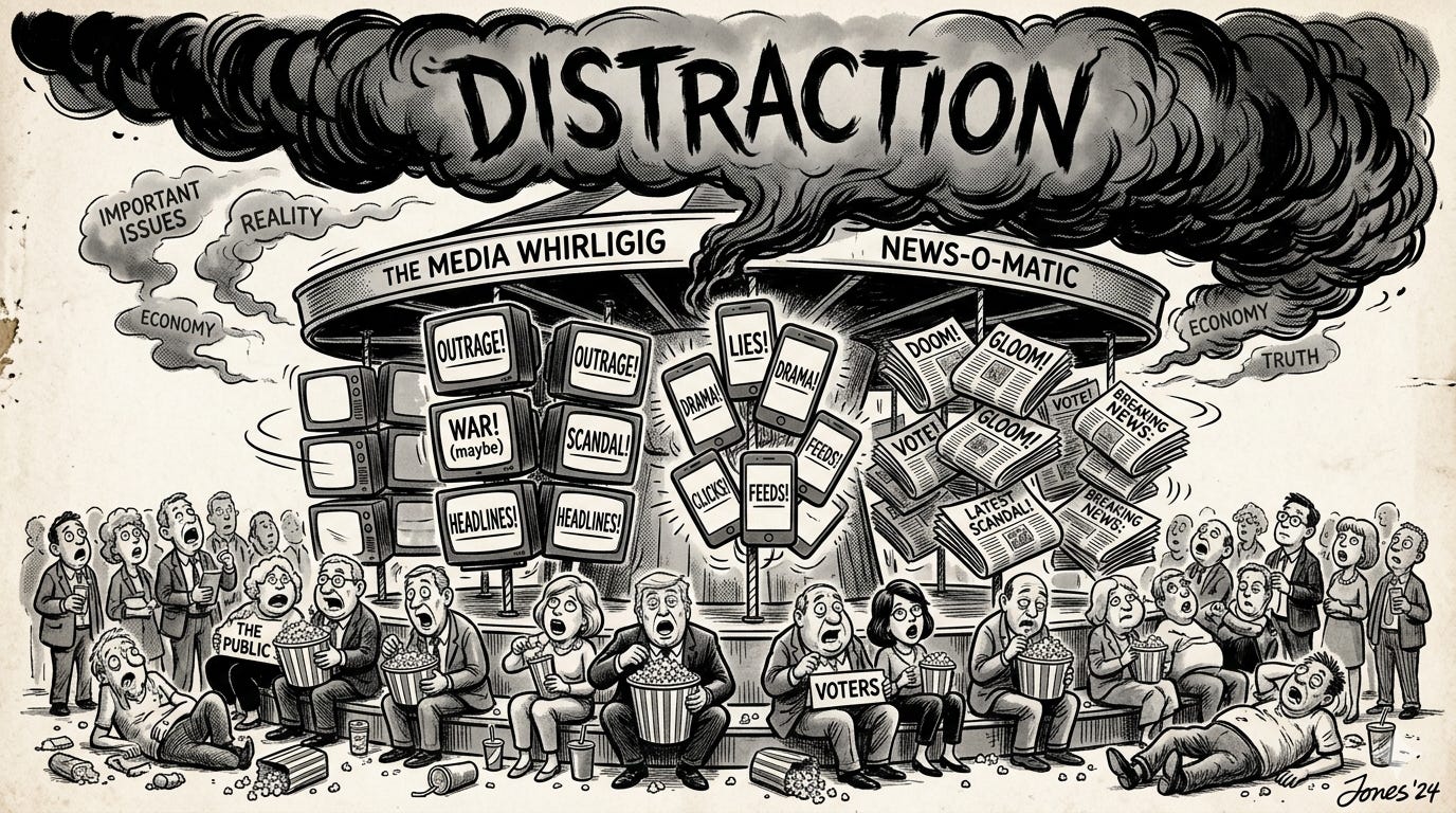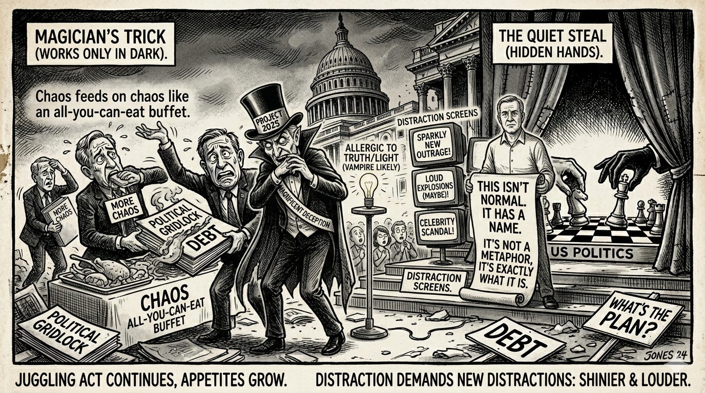 There’s a trick so ancient it probably pulled a fast one on the dinosaurs. The magician flails one hand like it’s auditioning for interpretive dance, “Look here! No, here! Yes, me!” while the other hand sneaks off to do the real work, smooth as butter and twice as slippery. No audience, no matter how smart or suspicious, escapes it every single time, because human attention is a tiny, fragile thing, and chaos is the most accomplished pickpocket ever to wear a metaphorical top hat.