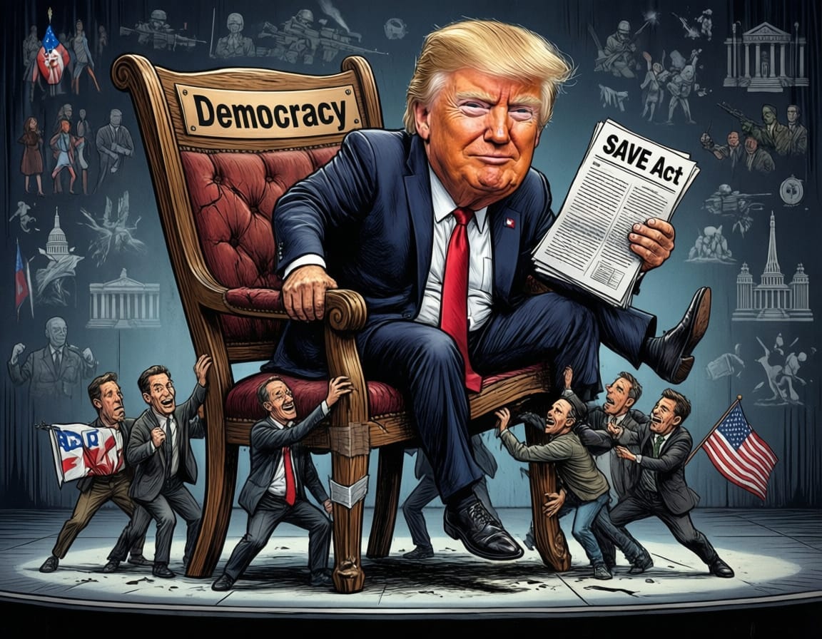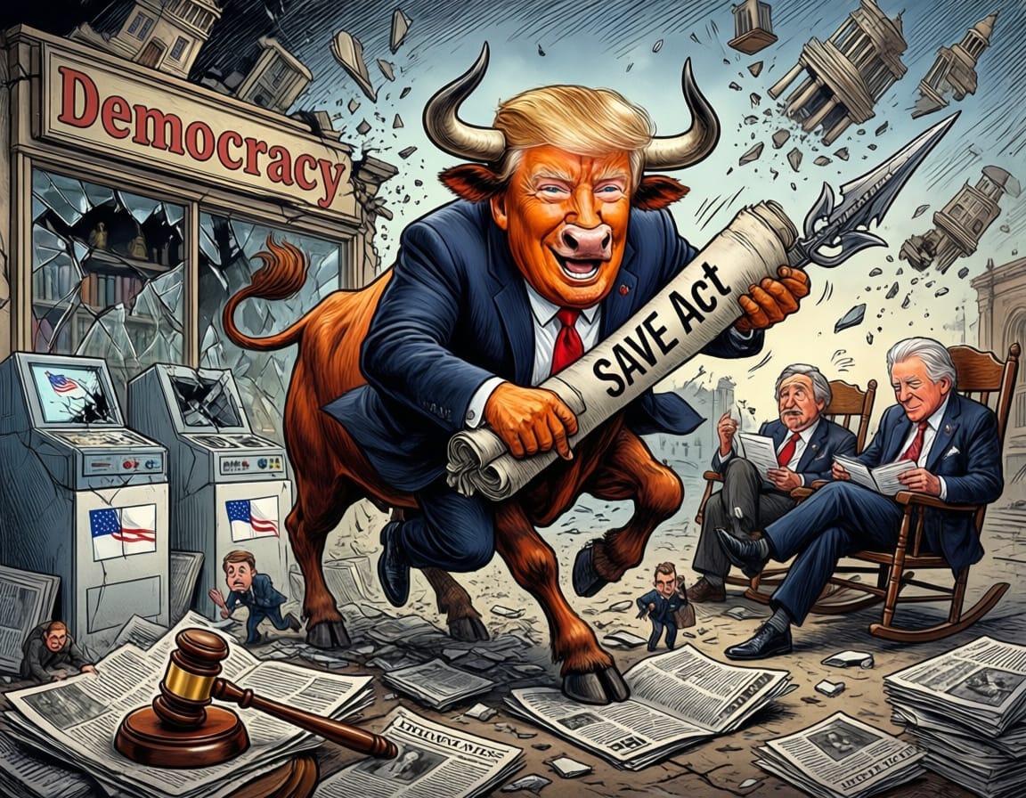 The SAVE Act is essentially a scheme to bench the opposition indefinitely. Trump, in his trademark aversion to subtlety, blurted it out in public without so much as a theatrical gasp: if it passed, Republicans could coast for the next half-century without breaking a sweat in a national election. This wasn’t exaggeration (because that would require a touch of self-awareness) but rather a masterclass in blunt-force political arithmetic, served up with all the grace of an orange bull in a democracy shop.