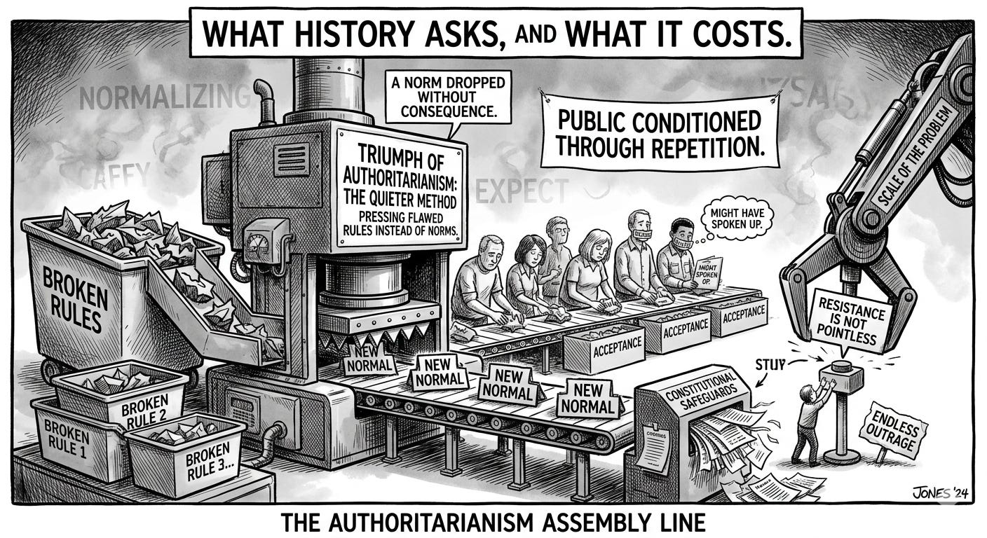 Historian Timothy Snyder points out that the triumph of authoritarianism rarely happens in the most dramatic moment. Instead, it’s quieter, more a norm dropped without consequence, someone who might have spoken up choosing silence, a public conditioned through repetition to expect each broken rule to be followed by another. People come to believe outrage is endless, resistance is pointless, and the scale of the problem is beyond what any one person can change.