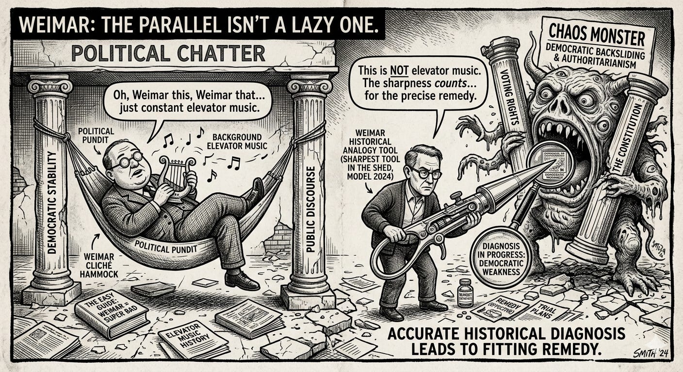 The Weimar Germany comparison gets thrown around so much these days, it’s like background elevator music; constantly playing until you forget it’s even there. It’s been repeated so often in political chatter that it now means little more than “super bad,” instead of serving as an actual historical analogy. This comparison isn’t lounging in a hammock; it’s, by any serious historical standard, the sharpest tool in the shed. And that sharpness counts, because the more spot-on the diagnosis, the more fitting the remedy.