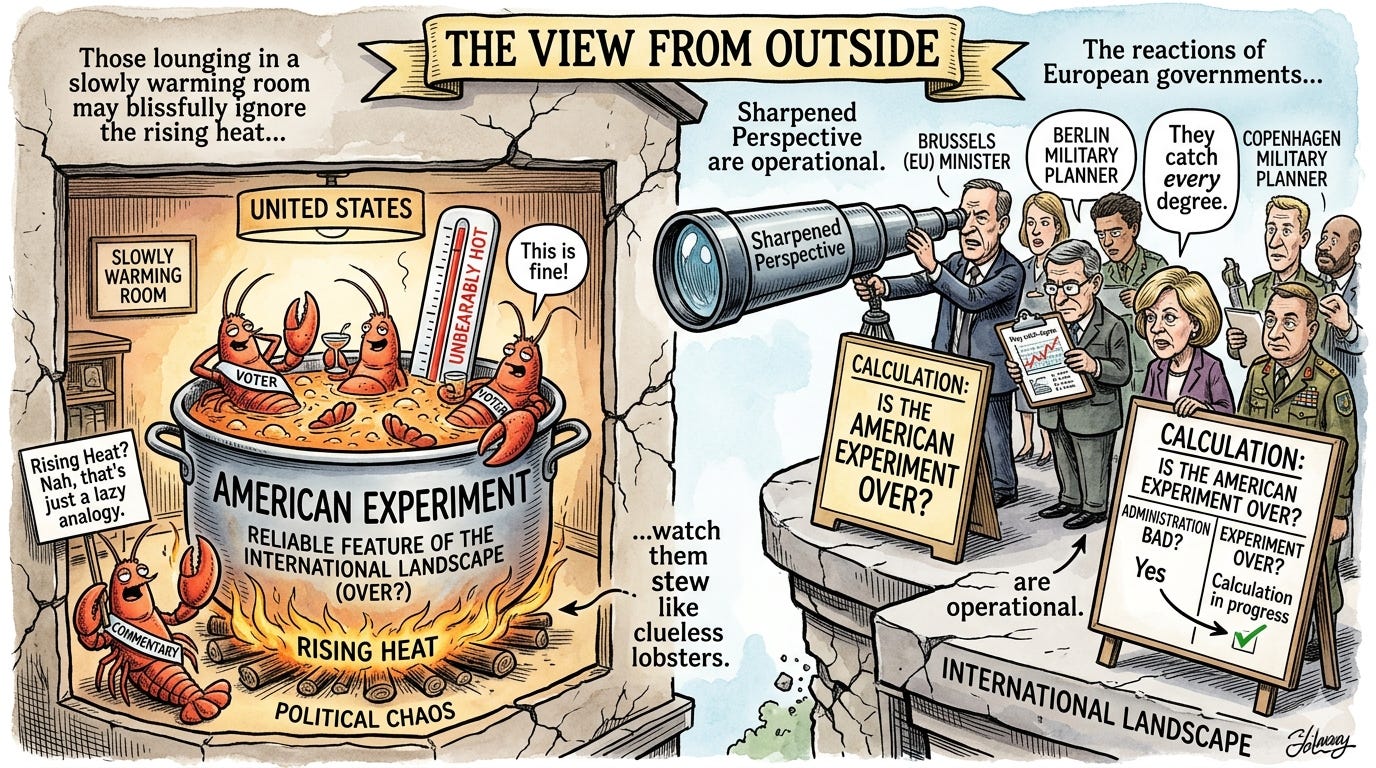 From outside America ( and the reactions of European governments, European military planners, and European foreign ministers are instructive here precisely because they are not rhetorical but operational), what is visible is something that American political commentary has been slow to name. The calculation being made in Brussels, in Berlin, in Paris, in Copenhagen, isn’t about whether the current American administration is bad; it’s about whether the American experiment, as a reliable feature of the international landscape, is over.