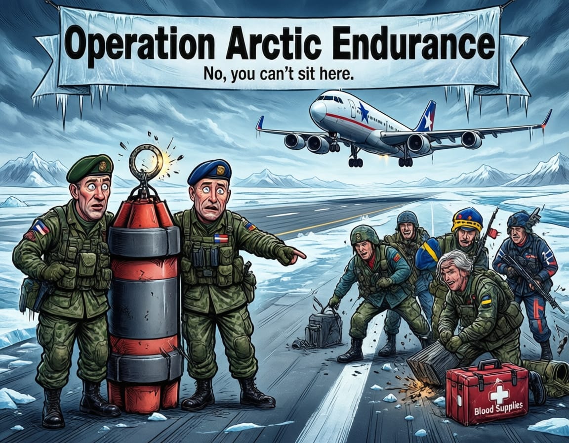 Somewhere on a frozen airfield in Greenland, Danish soldiers stand ready to blow up their own runways: not to halt a Russian charge, nor fend off a Chinese landing, but to keep American planes from touching down, like the world’s frostiest game of “No, you can’t sit here.” In early 2026, Operation Arctic Endurance sent troops from Denmark, France, Germany, Sweden, and Norway to Greenland, bringing along demolition explosives, runway-denial gear, and blood supplies for treating combat injuries. Officially, it was called an exercise, but no serious analyst buys that explanation.