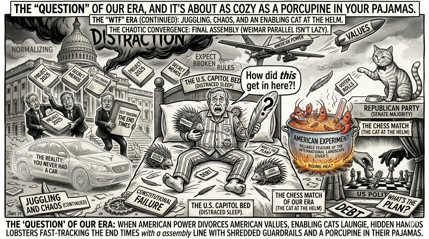 The duty (for journalists, citizens, historians, or anyone awake enough to notice) isn’t optimism; leave that shit to motivational posters and cat calendars. Optimism is a luxury this moment couldn’t afford, even on clearance. The duty is clarity and precision, while staring straight at the mess without blinking. Calling what’s happening by its true name, even when it sounds like a horror movie title, even when doing so paints a target on your back, and even when the thing named feels like a runaway boulder you can only chase in bad shoes.